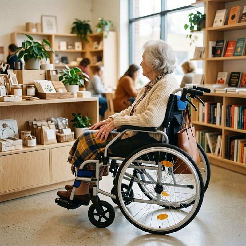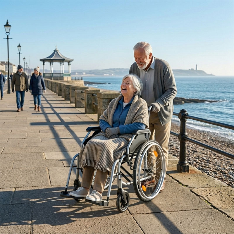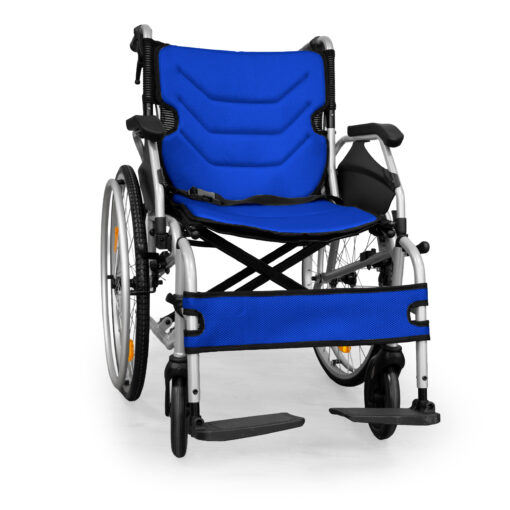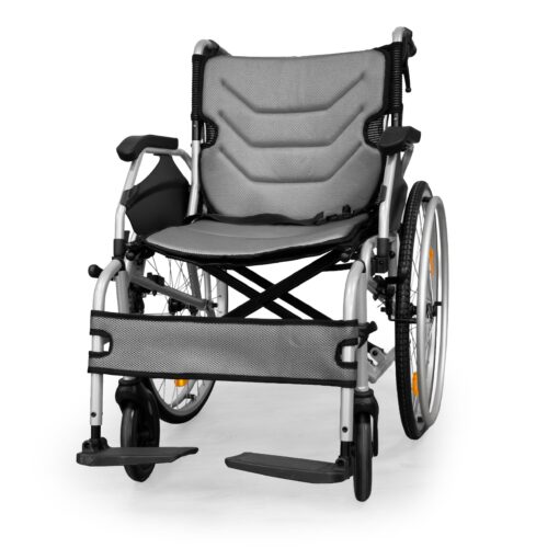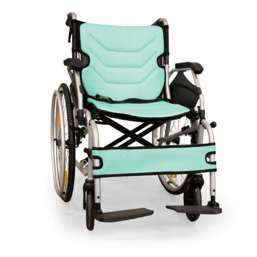 Designed for both indoor and outdoor use, the Wisp combines practicality with comfort. The lightweight frame folds quickly for transport or storage, while features such as flip-up armrests, adjustable footplates, and quick-release wheels make everyday use simple and convenient.
