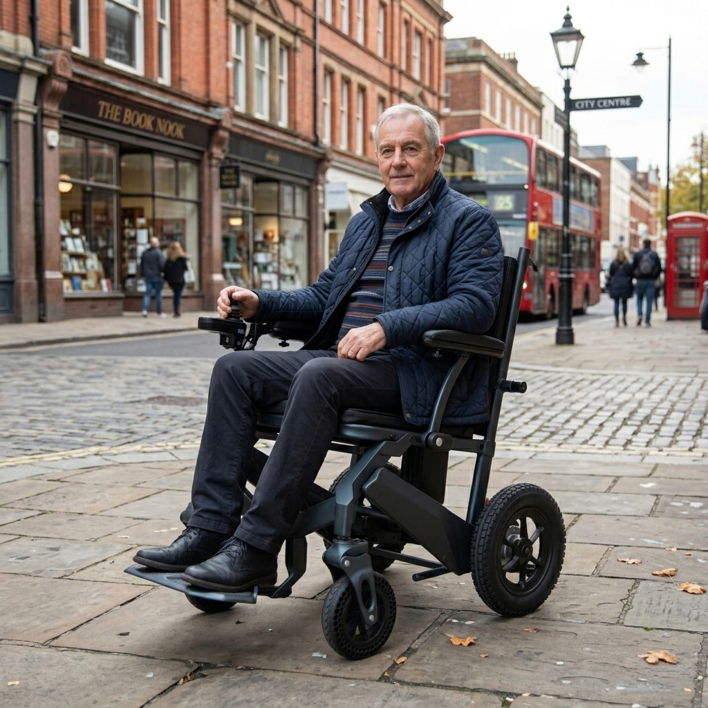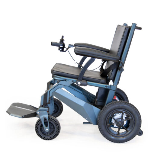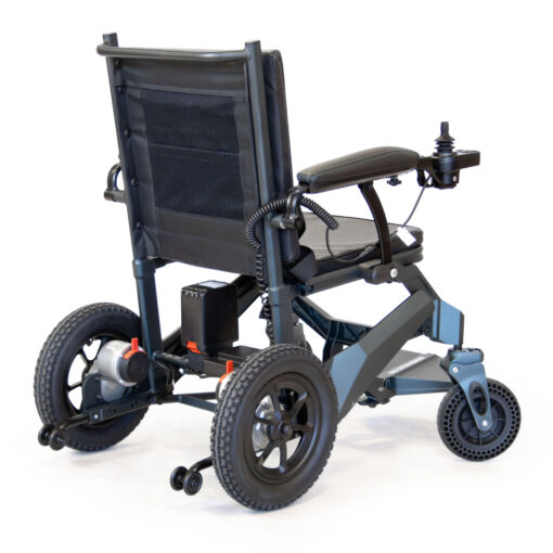 The Agile P53+ Powerchair is engineered with a lightweight yet robust aluminium and magnesium alloy frame, balancing durability with portability for everyday mobility use. It is powered by two 24V 10.6Ah lithium batteries, providing a practical operating range of up to 40km (25 miles) on a full charge, which supports extended daily use without frequent recharging. Dual 250W motors deliver consistent propulsion, enabling the chair to reach a maximum speed of 6 km/h (4 mph), suitable for controlled indoor and outdoor navigation. With a maximum user weight capacity of 135 kg (21.3 stone), it accommodates a broad range of users while maintaining structural integrity. The chair itself weighs 21.5 kg (3.4 stone), making it relatively manageable for transport and storage, particularly given its folding capability, reducing from 106 x 90 x 60 cm to a more compact 80 x 84 x 60 cm. Solid tyres are fitted as standard, eliminating the risk of punctures and reducing maintenance requirements, which enhances reliability across varied terrain.